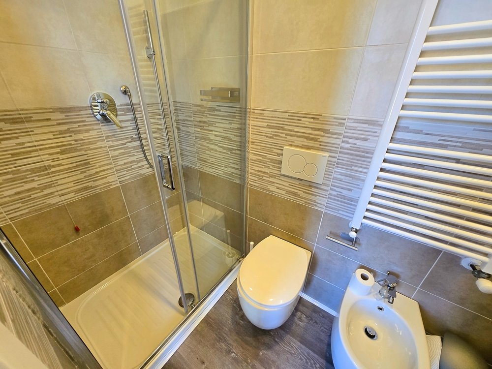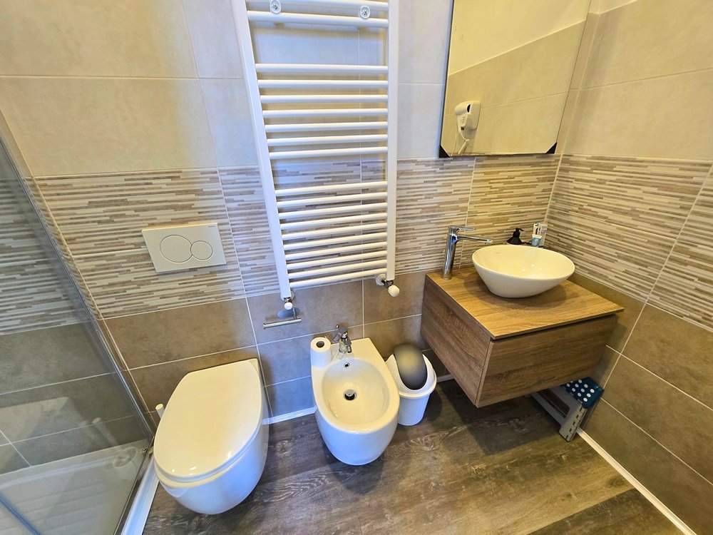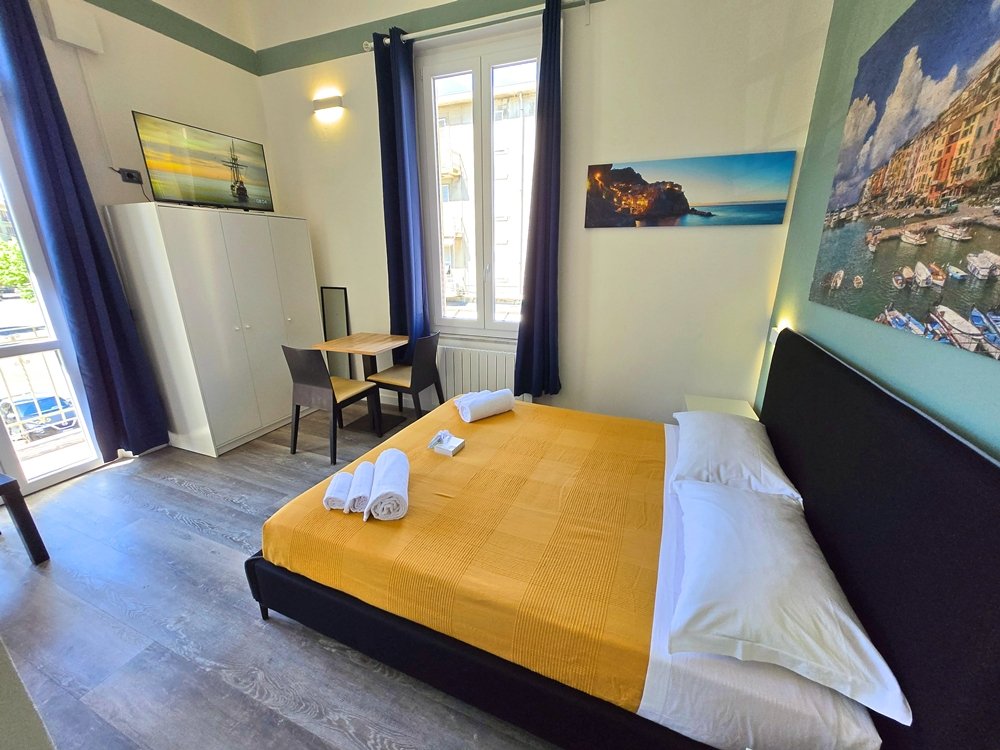 Il letto matrimoniale è ampio e confortevole, ideale per rilassarsi dopo una giornata trascorsa tra mare, città e Cinque Terre. La camera è dotata di aria condizionata, Wi-Fi veloce, TV a schermo piatto, scrivania, armadio capiente e frigorifero, offrendo tutto il necessario per un soggiorno comodo e senza pensieri. Le tende oscuranti garantiscono privacy e un riposo ottimale in ogni momento della giornata. Il bagno privato, moderno e ben rifinito, dispone di doccia spaziosa, bidet, termoscaldabiancheria, asciugacapelli e set di cortesia, con materiali e finiture curate nei dettagli.